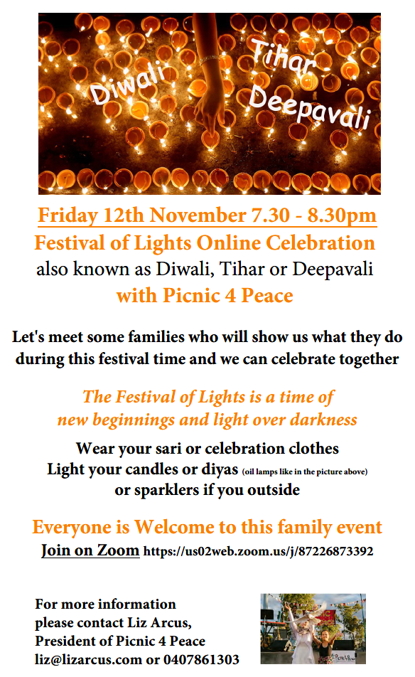 Picnic 4 Peace Festival of Lights Online Celebration View the recording of the event here. « World Peace Day 2021: Lighting a Candle for Afghanistan online with Picnic 4 Peace Picnic dinner for Easter, Ramadan + Nepali & Tamil New Years »